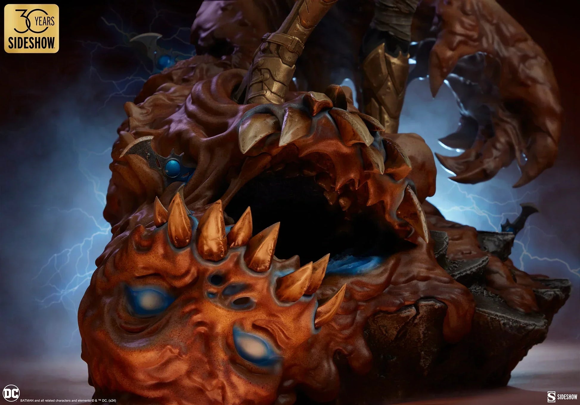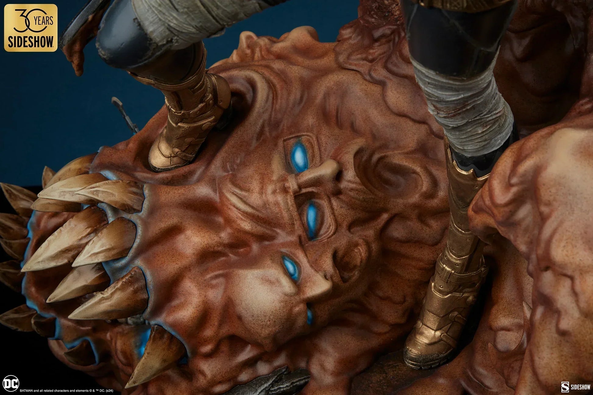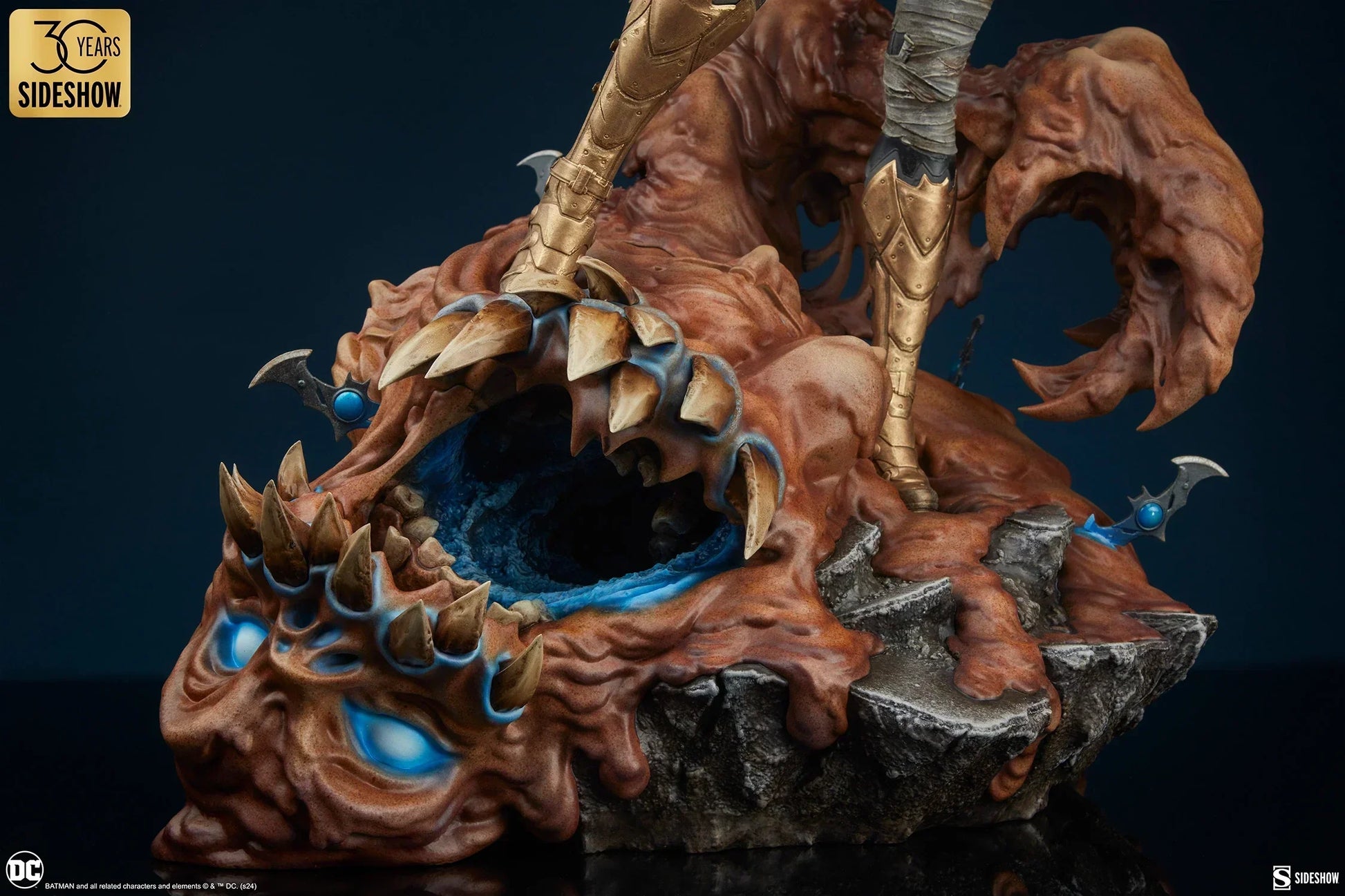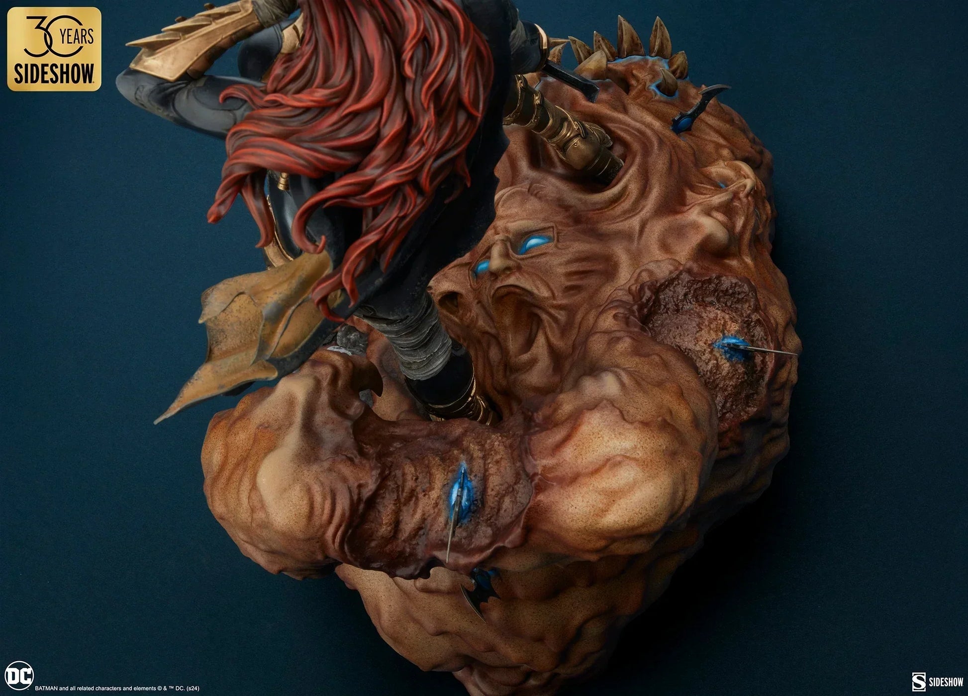 Die Polystone Batgirl Premium Format Figur misst 21,73” hoch, 13,43” breit und 13,9” tief. Inspiriert von den Charakteren, wie sie in DC Comics erscheinen, ist dieses Sammlerstück vollständig skulptiert, um alles von den Kostümdetails bis zu den unterschiedlichen Texturen von Clayfaces Körper einzufangen. Stoffähnliche Bandagen wickeln sich um Batgirls Arme und Beine, während ihr taktischer Batsuit mit gepanzerten goldenen Elementen wie Handschuhen, Stiefeln und einem Utility-Gürtel akzentuiert ist. Batgirls Outfit ist verwittert, um die Gefahren des Verbrechens in Gotham City widerzuspiegeln, und ein zerschlissener Umhang flattert von ihrer Schulter. Unter ihr wechselt Clayface zwischen schmelzender, schlammiger Pampe und getrocknetem, rissigem Boden, wo die Batarangs ihn getroffen haben.