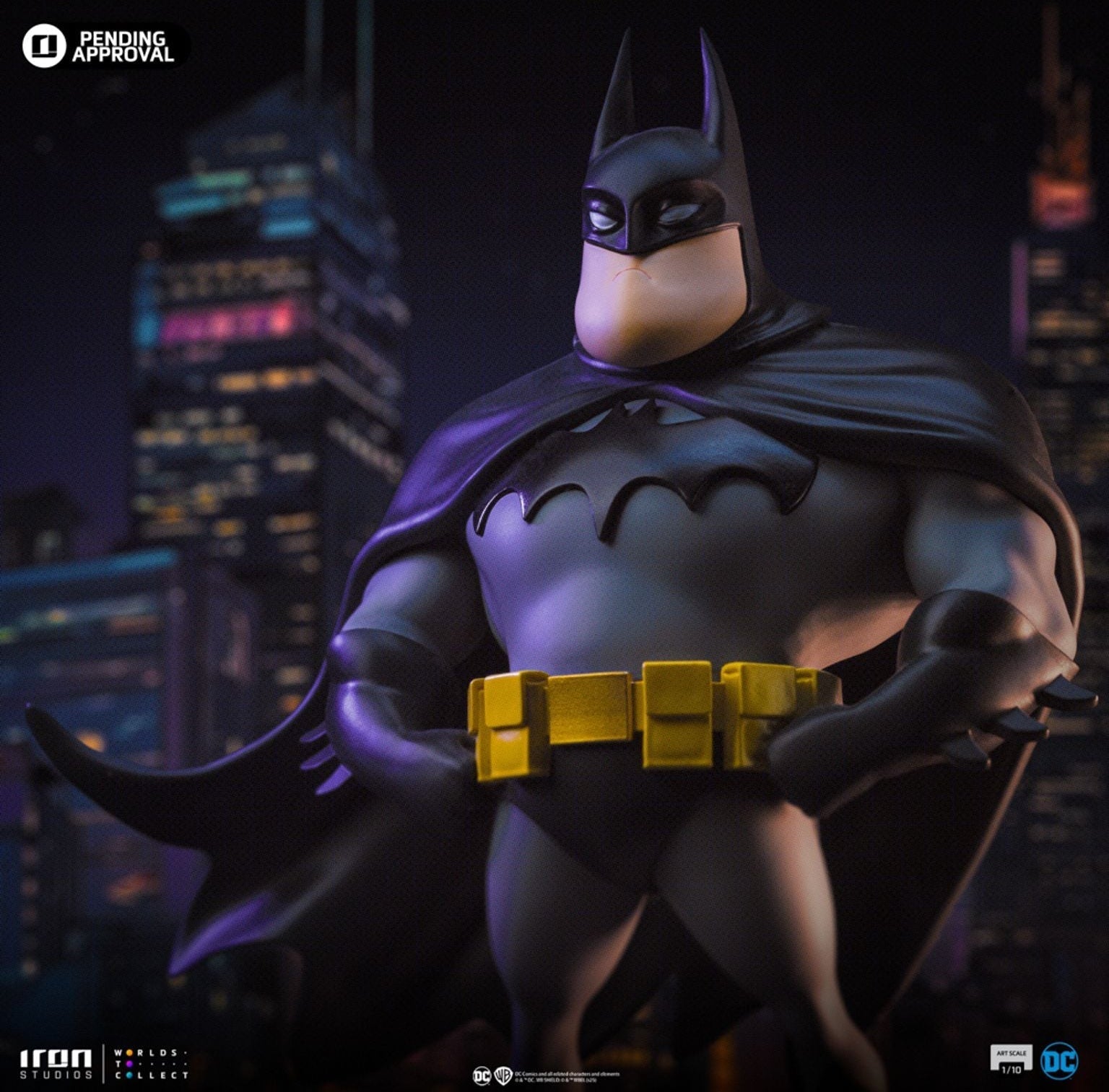 Die Statue von "Batman – DC Comics – Animated Icons" von Iron Studios zeigt Batman in einer entspannten Version. Mit einem ernsten Gesichtsausdruck und seinen Händen auf der Taille steht Batman auf einem Gebäude in Gotham City, während sein wehender Umhang ein dynamisches Gefühl von Bewegung erzeugt, das die Präsenz von Wind suggeriert.