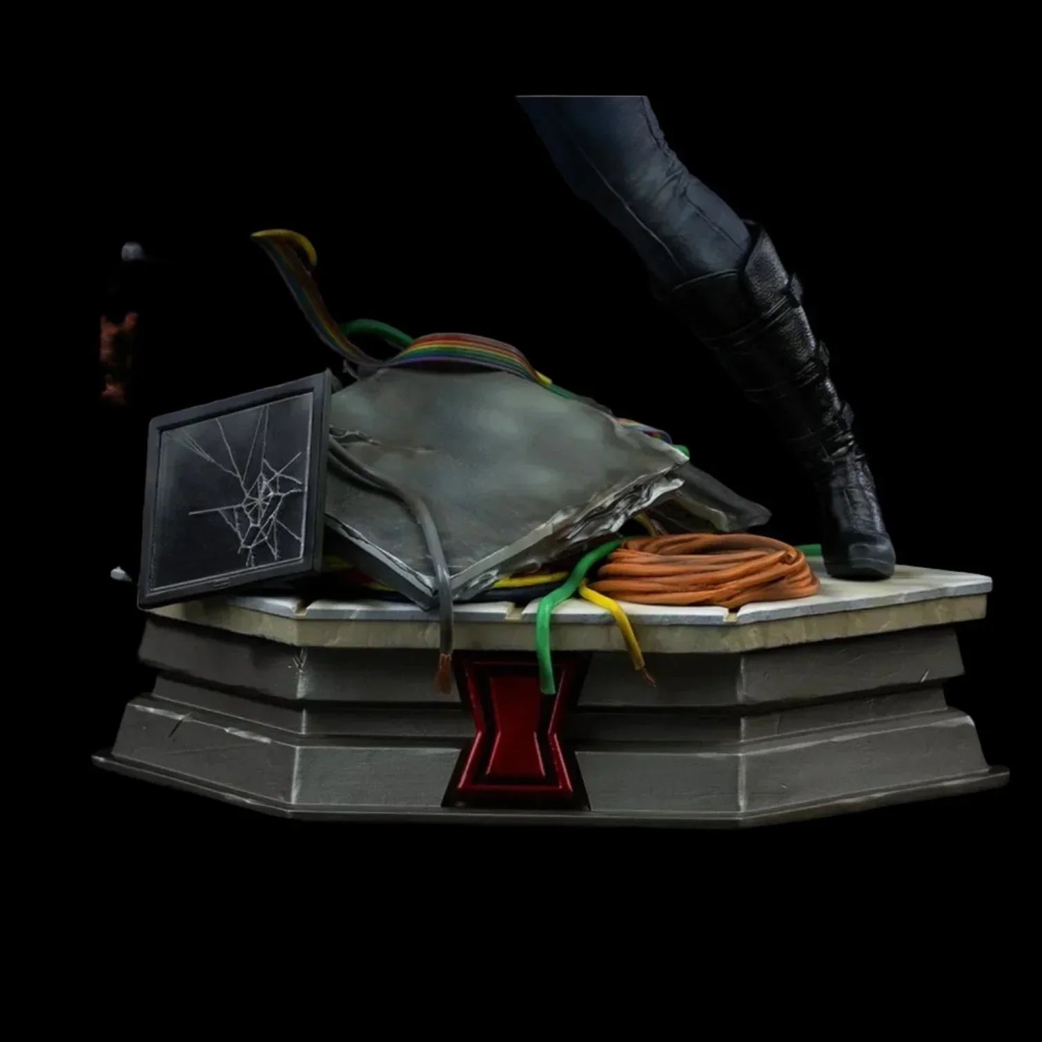 Inspiriert von ihrem ersten Auftritt in den Kinos im Film "Iron Man 2" (2010) erscheint die Spionin von S.H.I.E.L.D., Natasha Romanoff, bereit zum Kampf, mit ihren langen, lockigen roten Haaren, in einer taktischen Uniform der Agentur in dunklem Blau, die auf die klassischen Kostüme der Comics verweist, mit einer beeindruckenden Ähnlichkeit zum Gesicht der Schauspielerin Scarlett Johansson, auf einer Trümmerbasis in den Stark-Industrien, die an die Szene erinnert, in der sie sich den Handlangern des korrupten Justin Hammer stellt, einem Waffenhersteller und Rivale von Stark, und das Logo der Heldin auf ihrer Gürtelschnalle und auf der Vorderseite der Basis trägt. Auf diese Weise präsentiert Iron Studios stolz seine Originalversion des Avengers im UCM, in der "Black Widow Statue - Infinity Saga - Legacy Replica 1/4 - Iron Studios", einem der Stücke der Infinity Saga Reihe, die von Marvel geschaffen wurde, um die 10 Jahre des gemeinsamen Kinouniversums zu feiern, indem ikonische Momente dieser Filme in bemerkenswerten Szenen wieder besucht werden, die zur Saga führten, die in "Avengers: Endgame" materialisiert wurde.