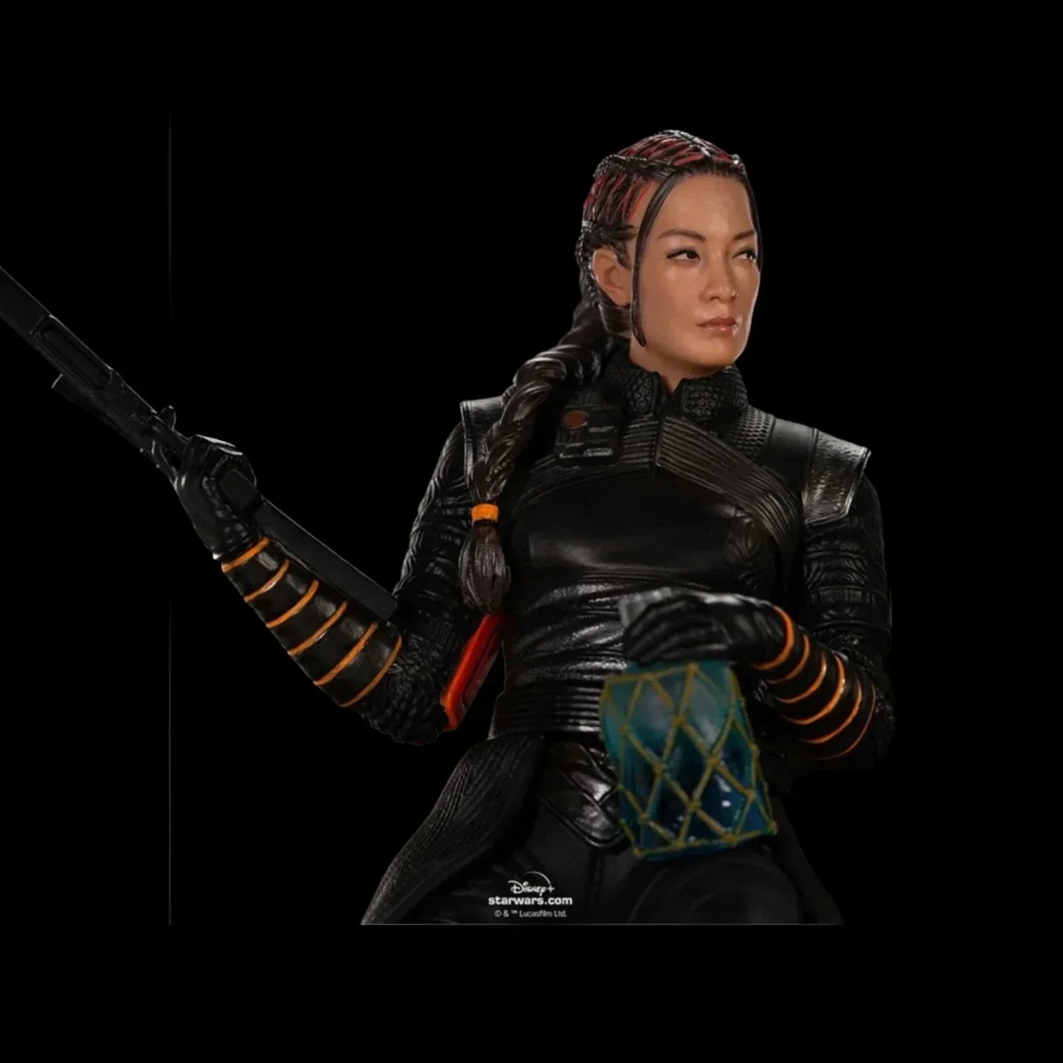 Der Kopfgeldjäger sitzt auf einem Thron, der mit monströsen bronzenen Köpfen dekoriert ist und die kleinsten Details der Post-Credit-Szene aus Staffel 2 der Serie "Der Mandalorianer" akribisch nachbildet. Diese Statue zeigt den ikonischen Star Wars-Söldner in seiner restaurierten Mandalorianer-Rüstung, mit seinem klassischen Blastergewehr, das auf dem linken Arm des Betonthrons ruht, und zeigt auch seine tödliche Verbündete, die auf dem rechten Arm des Thrones sitzt und ihr Blastergewehr hält. Die Statue reproduziert treu die Merkmale der chinesisch-amerikanischen Schauspielerin Ming-Na Wen, die Fennec spielt. Die Szene ist ein Vorgeschmack auf "Das Buch von Boba Fett", eine weitere Star Wars-Spin-off-Serie, die für Ende 2021 geplant ist.