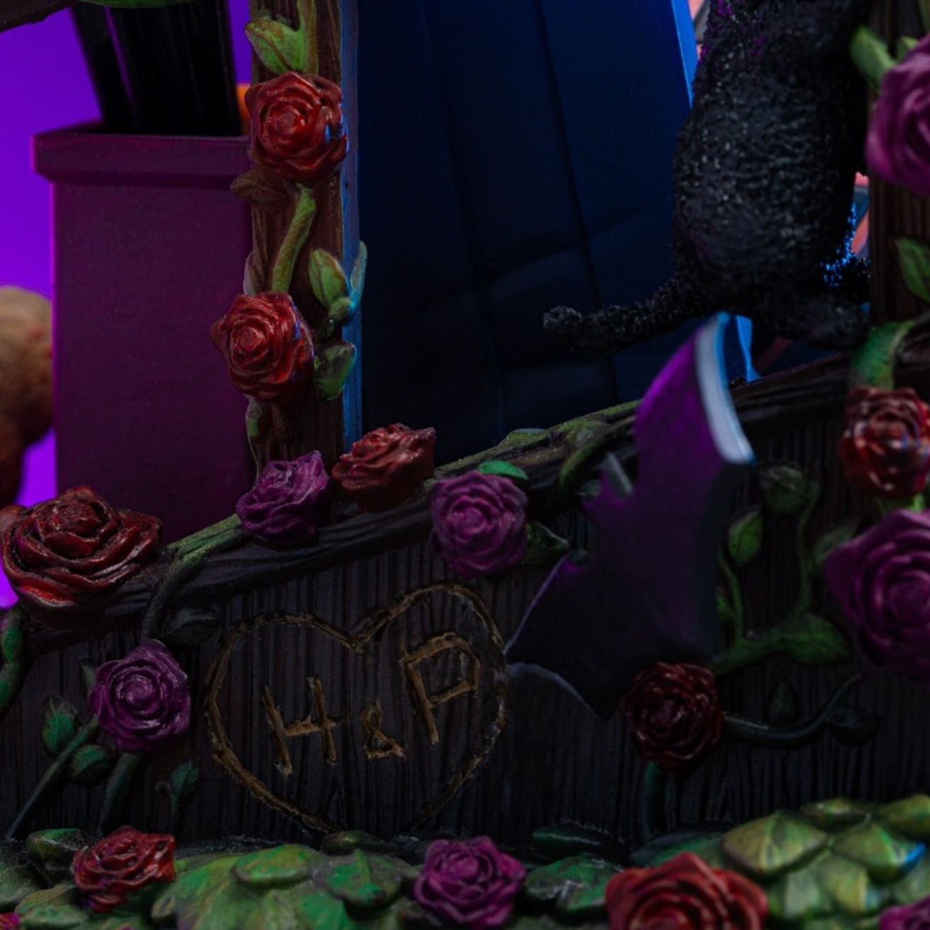 In dieser Deluxe-Version sehen wir Harley, wie sie auf ihrem linken Bein balanciert und sich mit ihrer rechten Hand auf einem Baseballschläger stützt. Die Basis bildet ein Diorama, in dem Harleen die Brust eines Joker-Plüschtiers mit ihrem Schläger zerdrückt, während sie sich gegen ein Holzgeländer lehnt, das mit grünen Ranken und roten Blumen bedeckt ist, mit einem Batarang, der darin steckt. Ein kleines High Striker-Spielzeug mit einem gebrochenen oberen Teil, das Punchline darstellt, die neue Anhängerin des finsteren Clown-Bösewichts, dient als Stütze für ihren riesigen Hammer. Vor ihr steht eine Kiste mit Waffen und Gadgets, die charakteristisch für andere ikonische lokale Verbrecher sind, einschließlich des Utility-Gürtels ihres Rivalen, Souvenirs vergangener Kämpfe, teilt den Raum mit einem weiteren Plüschtier ihrer Haustierhyäne namens Bruce. In dieser chaotischen Umgebung spielen zwei Kätzchen zwischen Doubloons und Goldbarren, zusammen mit der Bodenvegetation und Blumen, die auf ihre Verbündeten verweisen.