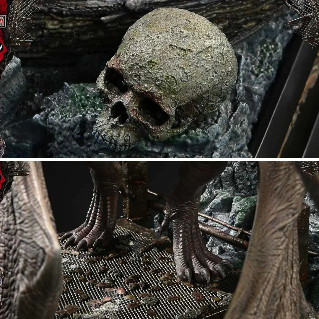 Eine erschreckende Szene entfaltet sich im Nebel – Schreie durchdringen die Luft, als das Kind in ein Nest gerissen wird, das von schrillen Rufen widerhallt. Inspiriert von dem Terror, den Eric erlebte, fängt diese Statue im Maßstab 1/6 die Welt der geflügelten Räuber in atemberaubenden Details ein. Der adulte Pteranodon faltet seine riesigen Flügel, während er das Nest darunter bewacht. Die hungrigen Jungtiere drängen vor, mit geöffneten Mäulern in Verzweiflung. Die Komposition evoziert ein starkes Gefühl von artenbasierter Einheit und vermittelt die Botschaft, dass dies kein Ort für Menschen ist – und dass auch der Betrachter als Beute angesehen wird.
