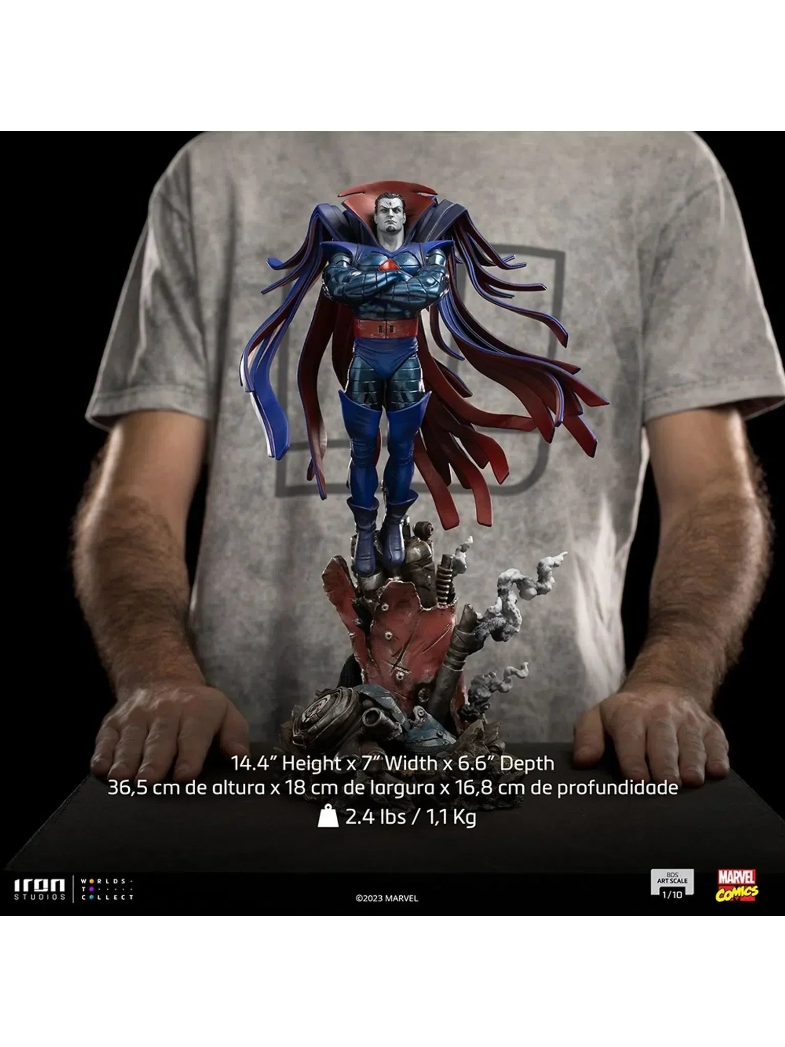Mit einer weißen Haut, so kalt wie Marmor, roten Augen ohne Pupille und scharfen Zähnen rechtfertigt sein Erscheinungsbild seinen Namen. Genetisch transformiert, hat einer der brillantesten Genetiker der Welt seine Transformation über Jahre hinweg verbessert, indem er genetisches Material bestimmter Mutanten in seine DNA integrierte, um mehr Fähigkeiten zu erlangen. Mit seinen telekinetischen Kräften, die es ihm ermöglichen, zu levitieren, schwebt der einzigartige Bösewicht über den mechanischen Trümmern eines brennenden Sentinel-Roboters, wahrscheinlich von seiner kürzlichen Zerstörung. Mit der Fähigkeit, jedes Molekül seines Körpers zu kontrollieren, in der Lage, die Einschläge zu absorbieren und jeglichen Schaden zu regenerieren, seine Masse zu verändern und zu modifizieren mit einer Formwandlerfähigkeit, die es ihm ermöglicht, die Gestalt von jedem anzunehmen, zusammen mit vielen anderen Kräften wie Telepathie, schockartigen Explosionen, Geschwindigkeit, Ausdauer, Stärke und übermenschlichen Sinnen, macht ihn zu einem der gefährlichsten und tödlichsten Feinde der X-Men. Mit seinem klassischen Aussehen in einer Rüstung in Blau-, Silber- und Rottönen, mit einem Umhang aus Streifen, der sich wie Flügel von seinem Rücken entfaltet, bringt Iron Studios die Statue "Mr. Sinister - X-Men - BDS Kunstskala 1/10", mit dem Bösewicht, Meister der Manipulation und strategischen Denkens, einem der von Fans und Sammlern am meisten geforderten Charaktere für die Sammlung von Statuen, die das Schlachtendiagramm der X-Men darstellen, die gegen die von Magneto und vielen anderen Bösewichten kontrollierten Sentinel-Roboter kämpfen.
