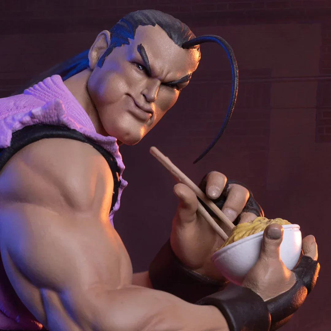 Dan hingegen sitzt lässig, mit übergeschlagenen Beinen, über eine dampfende Schüssel Nudeln gebeugt. Er schaut über seine Schulter, als wäre er durch die Unterbrechung seiner Mahlzeit genervt, aber nicht genug, um langsamer zu werden. Sein Porträt ist meisterhaft skulptiert, um nicht nur seine Verärgerung darzustellen… sondern auch seine klare Mundvoll Nahrung. Sein pinkes Gi ist in großartiger Detailtreue skulptiert und steht im Kontrast zu seinen dunkelbraunen Handschuhen und seinem Rash Guard. Ein pinkes Haargummi, das zu seinem Gi passt, hält seinen engen Pferdeschwanz an Ort und Stelle, abgesehen von einem einzelnen Haarstrang, der von seiner Stirn absteht.