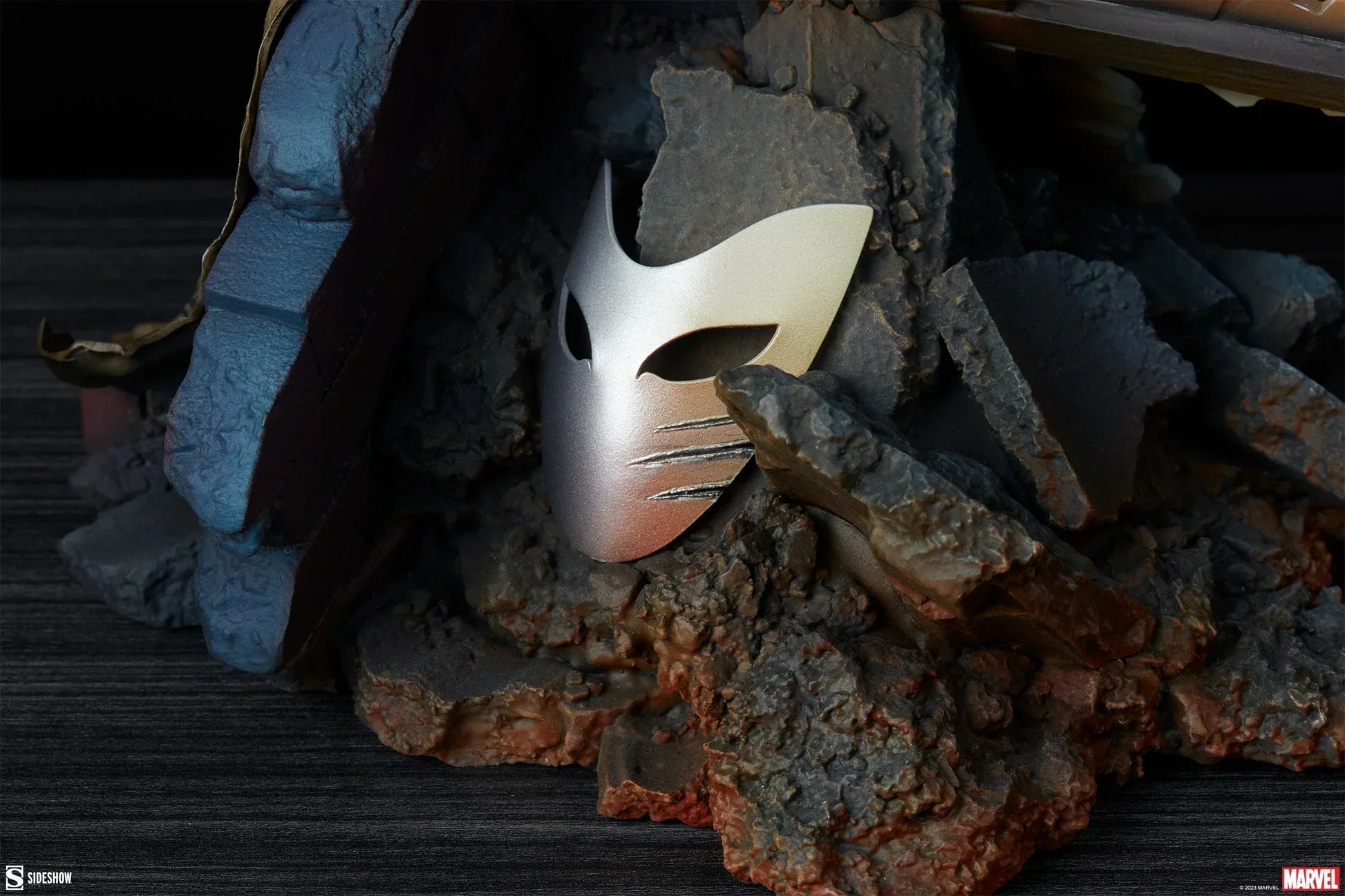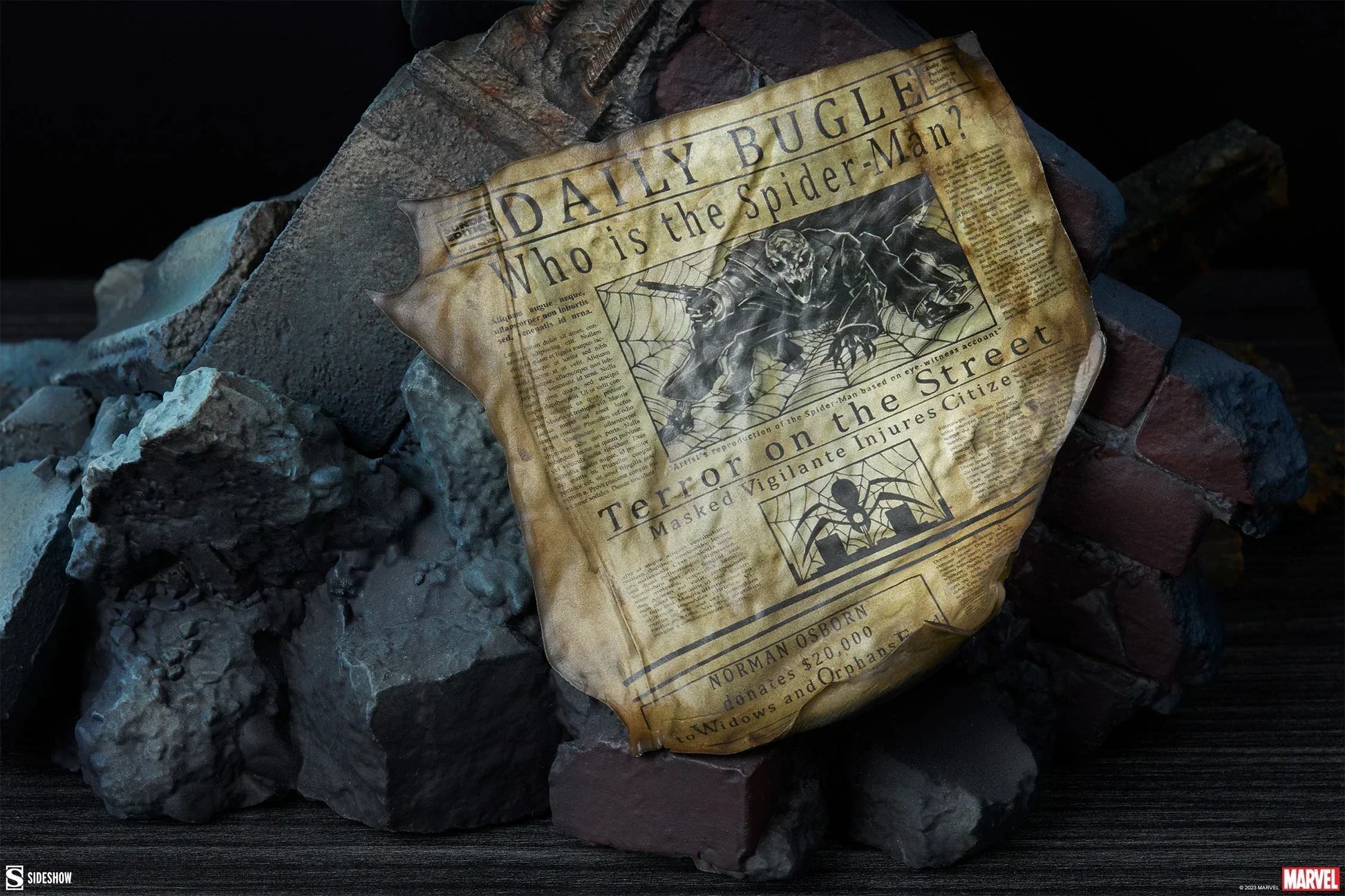 Die Spider-Man Noir Premium Format Figur ist vollständig skulptiert und sorgfältig bemalt, um ein dramatisches, vom Wind verwehtes Abenteuer eines Wandkletterers durch die Skyline der Stadt zu evokieren. Peter Parkers Kostüm besteht aus einem dunklen, lederähnlichen Trenchcoat, einem Rollkragenpullover, einer Hose, Stiefeln und seiner aufwändigen Spider-Man-Maske, die mit einem Fedora ergänzt wird. Das theatralische Design verwendet warme Orangetöne, um das Innenlicht, das aus dem Gebäude strömt, darzustellen, während blaue Akzente die Falten seines Kostüms und die vom Film Noir inspirierten Ästhetik dieser alternativen Erde betonen.
