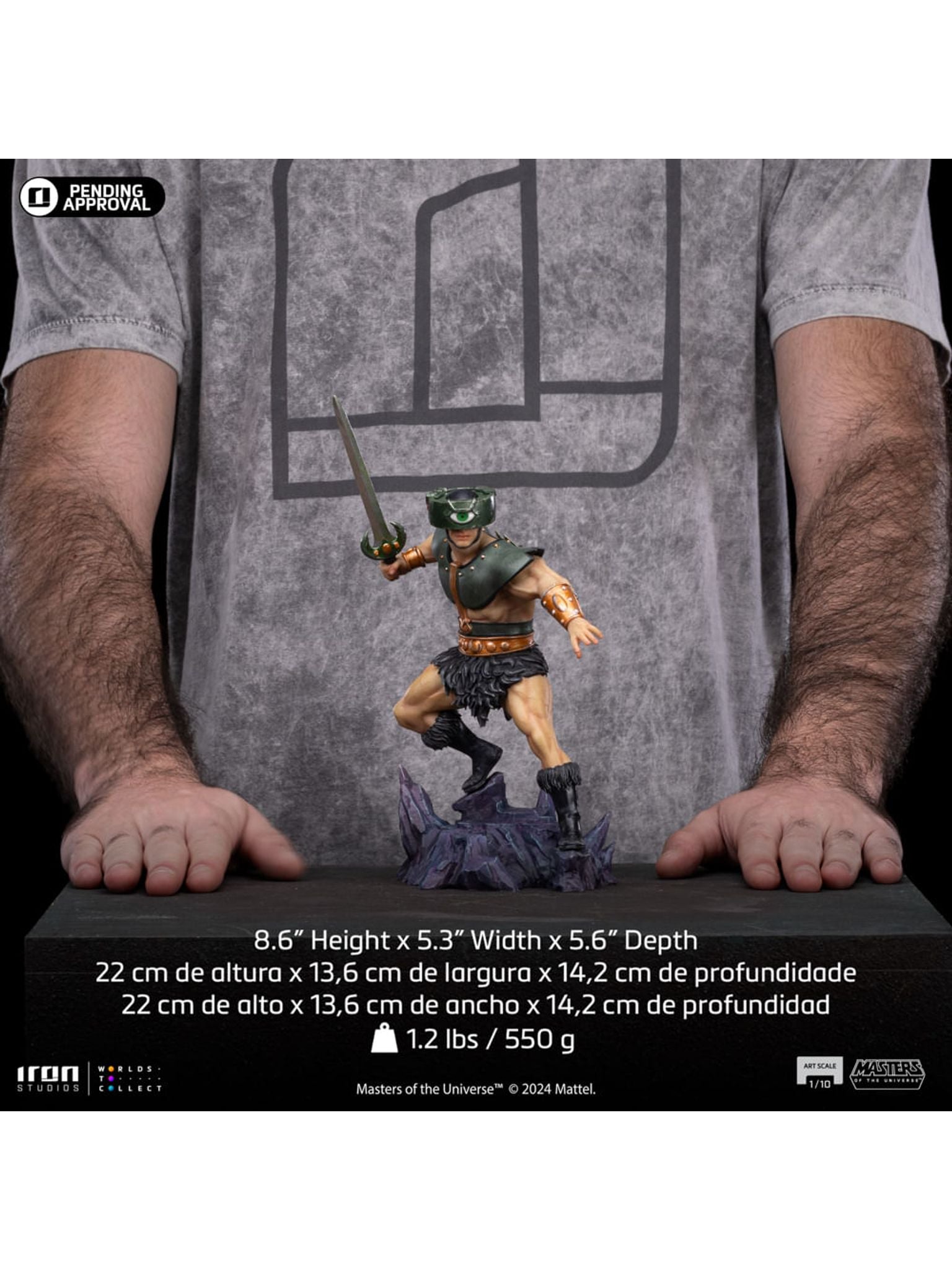 In seiner charakteristischen grünen Rüstung mit Fell, bereit zum Kampf gegen He-Man und seine Verbündeten, stehend auf einer gezackten Felsbasis, können wir Tri-Klops' Meisterschaft im Kampf sehen. Mit einem Schwert in seiner rechten Hand und Dolchen auf seinem Rücken ist seine größte Waffe das prägende Merkmal seines Charakters, sein drehbarer Helm mit drei unterschiedlichen Augen, der es ihm ermöglicht, aus großer Entfernung, in völliger Dunkelheit und sogar durch feste Objekte zu sehen. Dies ist die "Tri-Klops – Masters of the Universe – Art Scale 1/10" Statue von Iron Studios, die einen weiteren Bösewicht aus Eternia zeigt.